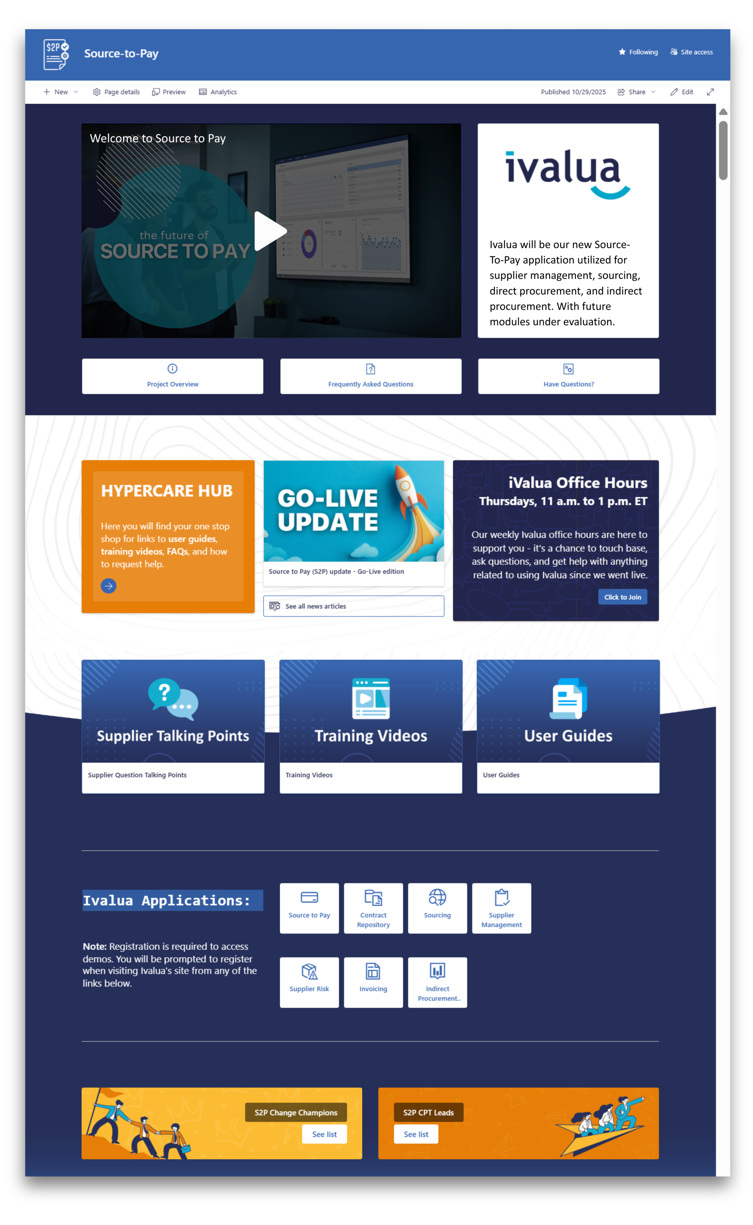 Designed and developed a centralized SharePoint Online portal to support the rollout of a new Source-to-Pay (S2P) system, improving access to training, updates, and support resources.